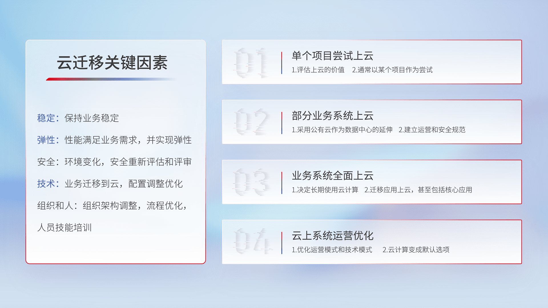 结合实际业务,,从规划设计、、云平台选型、、、、云原生改造、、、、数据迁移、、集成交付,,,迁移全过程为客户识别最佳上云路径,,做好风险识别管理,,,设计网络架构、、、、身份权限、、安全审计合规、、、、操作审计、、、日志审计、、、、监控告警策略、、、多站点容灾设计等,,,,对云上基础设施进行整体规划,,,提升IT治理水平,,,以满足弹性、、高可用、、、、高性能的需求。。。。